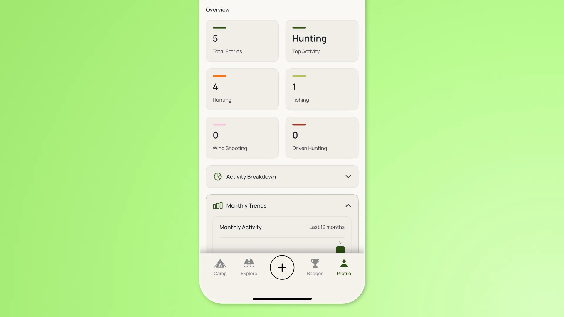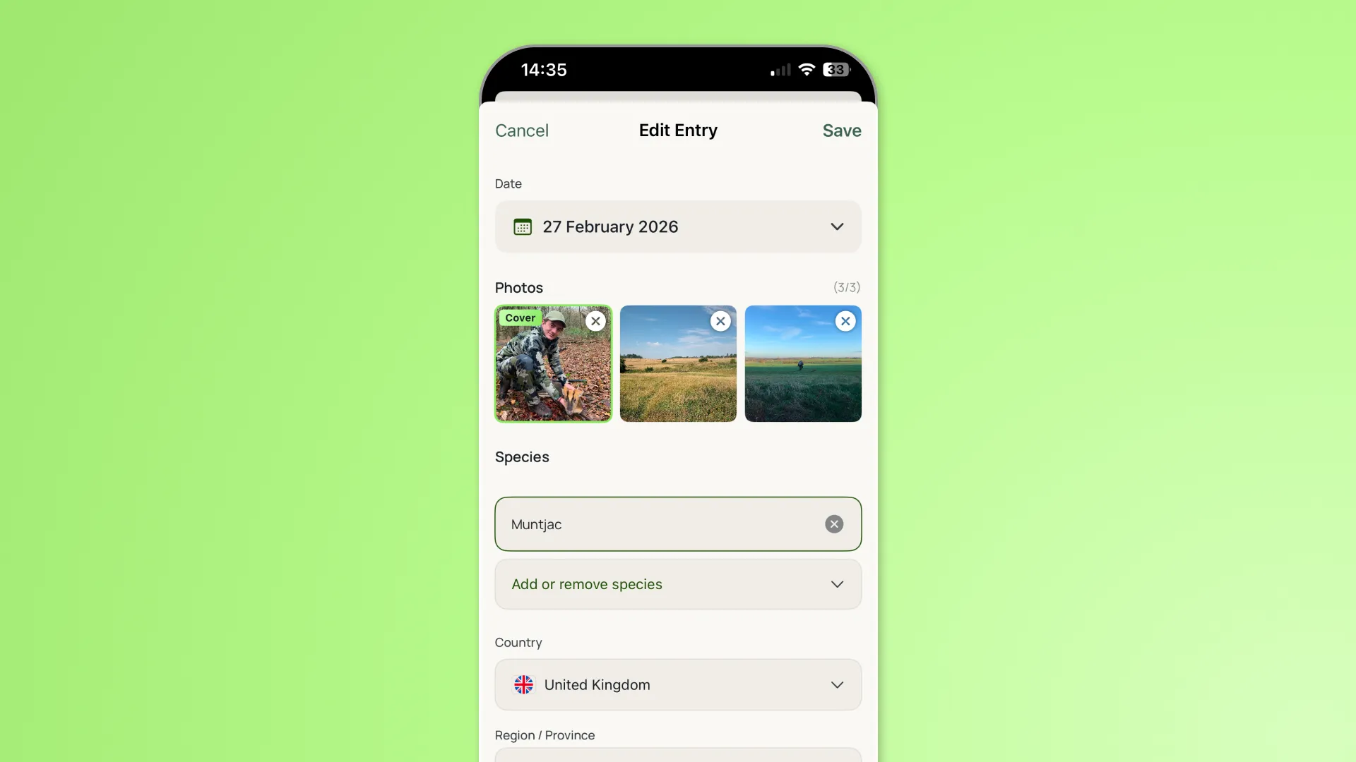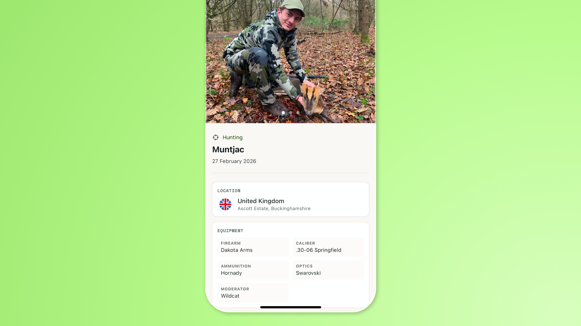 Come back from the field, open the app. Select your discipline. Add the date, the ground, the conditions. Record your bag or catch with the kind of detail that matters to you.